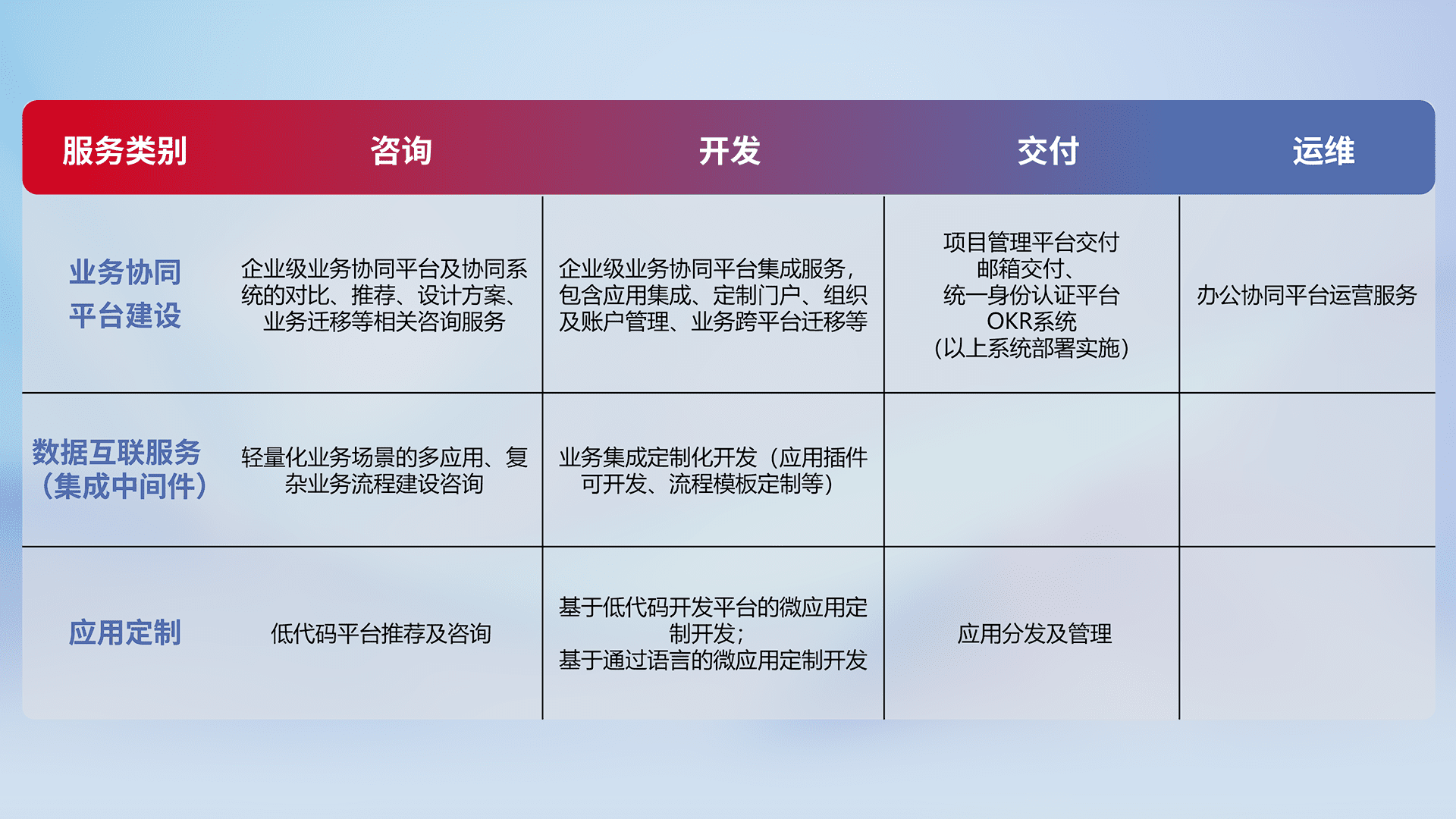 针对钉钉、、、、企微、、、、IDaas等平台级产品提供产品的规划、、、方案、、、、交付、、、、定制化开发等服务,,,实现如统一协同办公、、、智能客户服务、、、混合会议管理、、、、智能数据查询、、、、等业务场景,,,实现数字化转型。。。